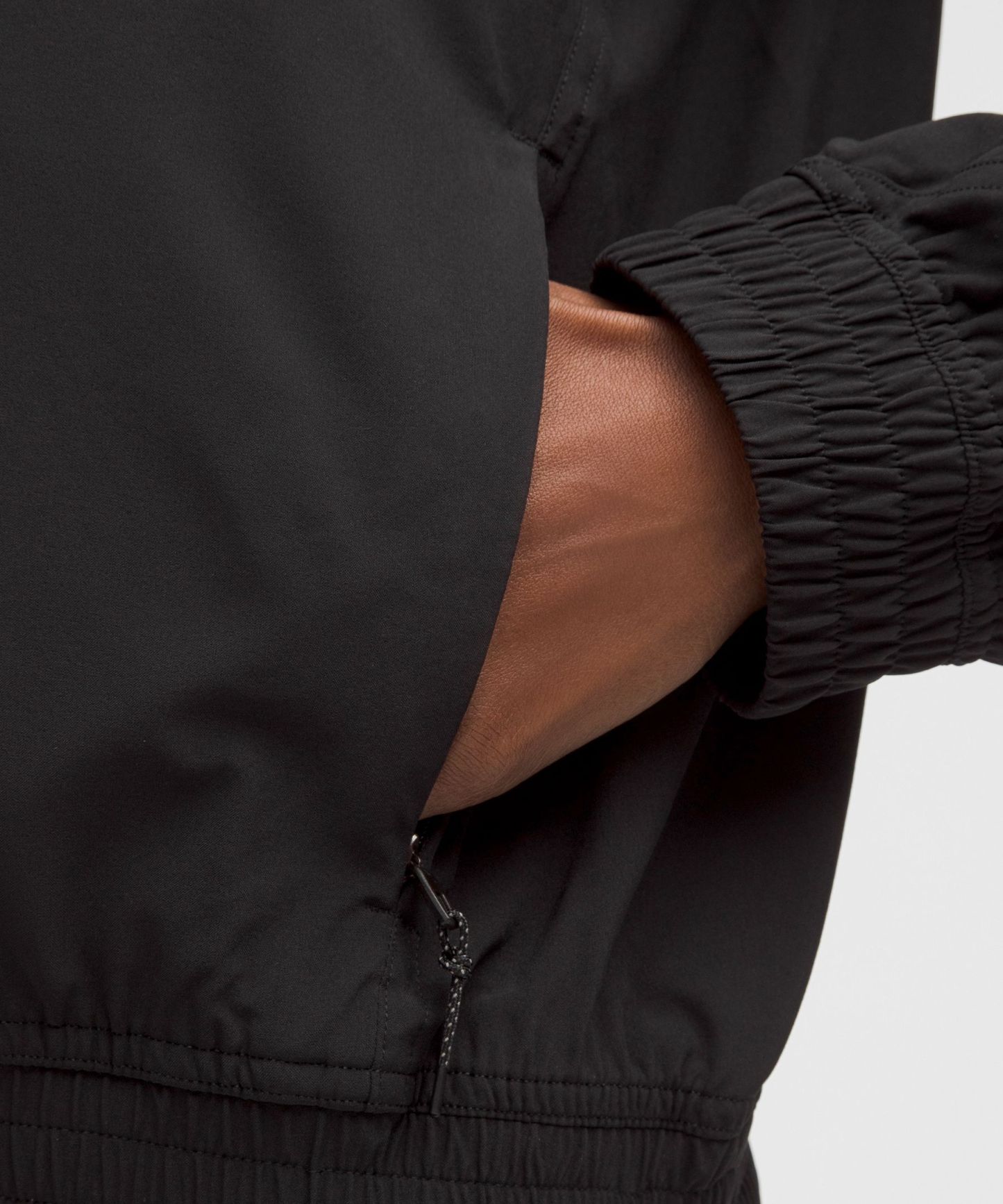 - Zippered hand pockets with hidden phone sleeve