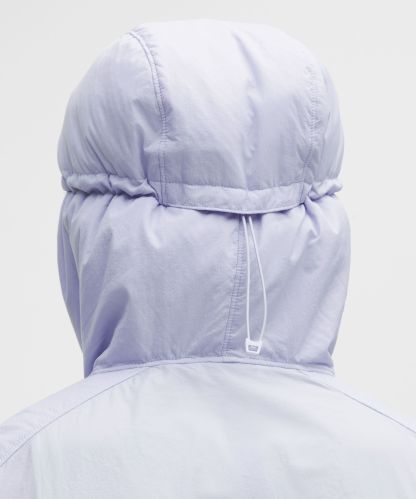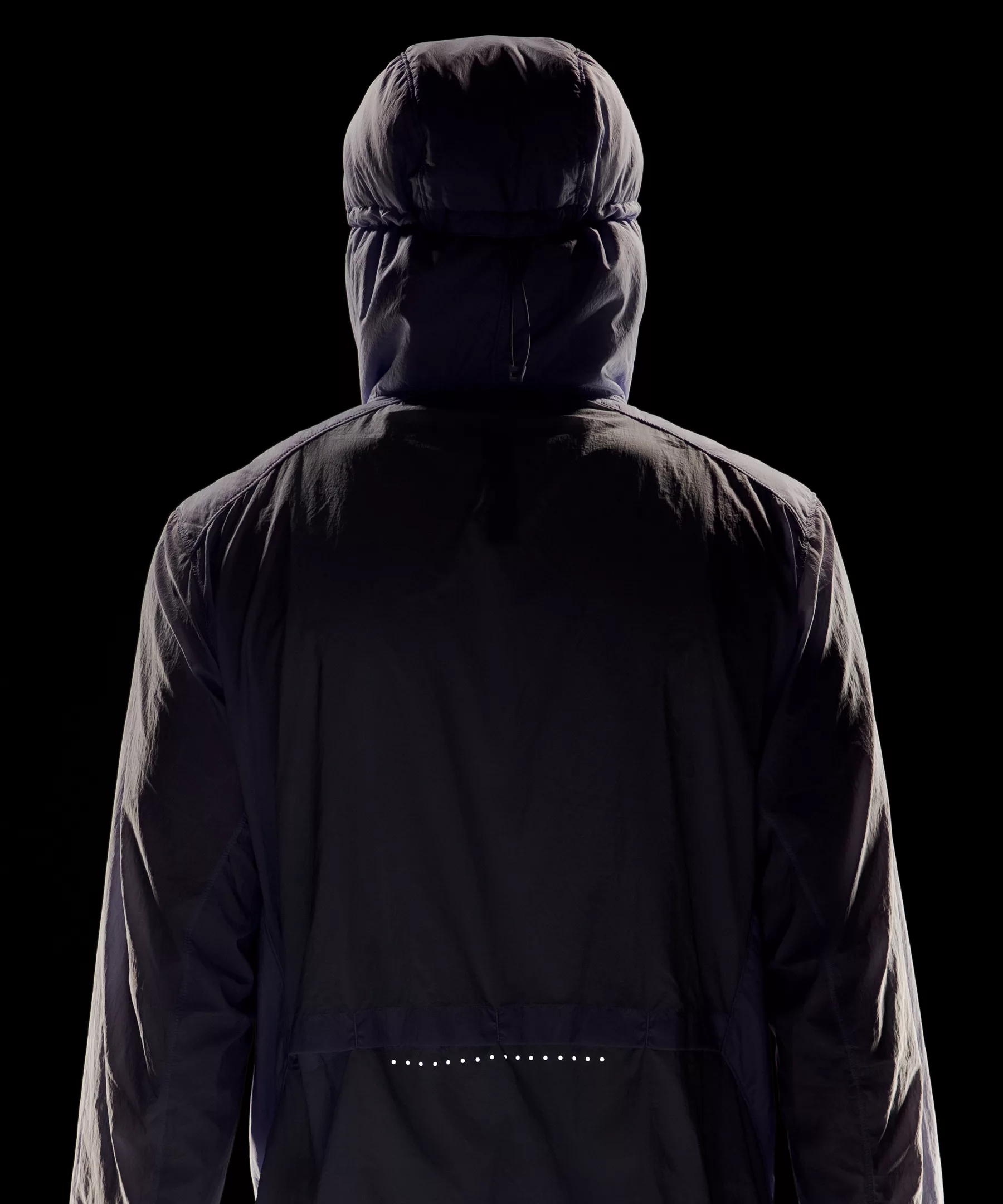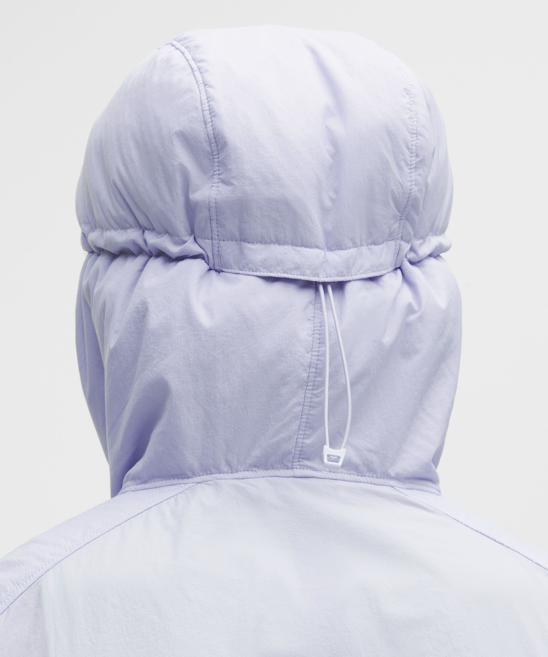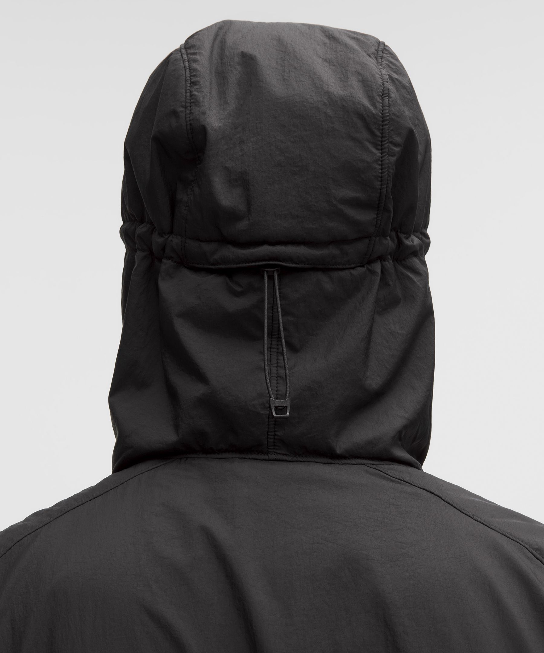 - Close-fitting hood cinches at the back